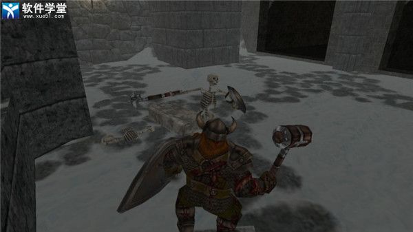 6、在圣殿内先消灭掉新的敌人--骷髅武士,不过细心的玩家一定会注意到这个兵种攻击的时候非常有规律,而且破绽非常的大,只要在他攻击的时候使用锁定后的左右移动就可以躲避并且攻击到他,一点HP都没有损失。进入圣殿的中间,以面对座椅为中心,左侧的一个洞穴中消灭将是以后取得钥匙(Rusted Key),到右侧的通道中打开铁门。注意消灭僵尸等敌人。跳过二层木板的漏洞一直到角落山洞中,此处有一个开关(Lever)。扳动开关以后,一层的石门缓缓的打开了。