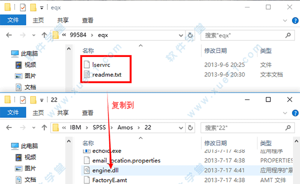 3、安装成后,将数据包中“eqx”文件夹下的文件复制到软件的安装目录下,默认安装目录:“C:\Program Files (x86)\IBM\SPSS\Amos\22”。
