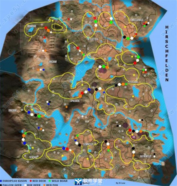 如何找到猎物水对于动物是必需品,所以沿着水路找肯定会有发现。在地图上会有“饮水区”、“进食区”、“居住区”三个类型的动物聚集地,会有时间提示,在这个时候靠近会有大概率找到动物。下面两个图可以宏观地找到两个地图中的动物聚集点。其中北美图东北方向的卡尔本河段是著名的狩猎天堂,大量的鹿群,特别是高概率出现4级以上的鹿群,有一定的装备基础之后就可以直奔卡尔本练级赚钱。