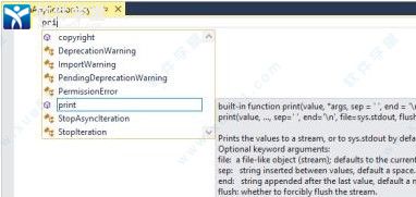 2、在编辑器中,开始键入 print("Hello, Visual Studio"),注意 Visual Studio IntelliSense 如何在此过程中显示自动完成选项。 下拉列表中加外边框的选项是按 Tab 键时使用的默认完成选项。 涉及到较长的语句或标识符时,最适合使用“完成”。