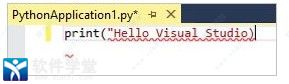 5、注意语法着色如何区分 print 语句与 "Hello Visual Studio" 参数。 另外,暂时删除字符串上的最后一个 ",并注意软件如何在包含语法错误的代码下方显示一条红色下划线。 然后,替换 " 以更正此代码。