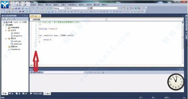 3、回到VS主界面,这时会在左侧和右侧多了如图工具栏“解决方案管理器”,在源文件上点右键,选择“添加→新建项”。这里注意,如果你已经有写好的C源文件,那么要选择“现有项”。