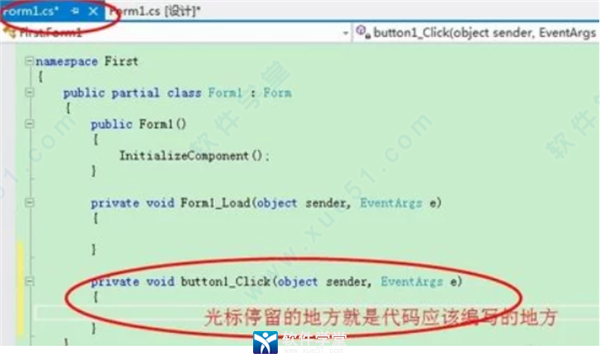 4、查看代码:控件添加完成后就要开始编写程序,进入代码的编写窗口中,单机选中要编写控件,然后双击或直接按F7键跳转到代码界面。