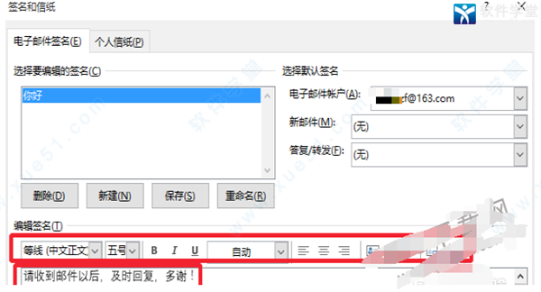 3、接下来我们就进入到签名和信纸界面,如果你有多个邮箱账户,那么我们需要现在界面右上角的电子邮箱账户选项中选择要设置签名的邮箱,然后再点击界面中的“新建”选项。