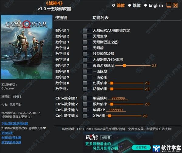 战神4修改器风灵月影版,它可以支持玩家们修改无限气血,无限力量,无限冷却等等功能,帮助我们可以在游戏中有一个很好的游戏体验感,有兴趣的小伙伴们可以来试试!