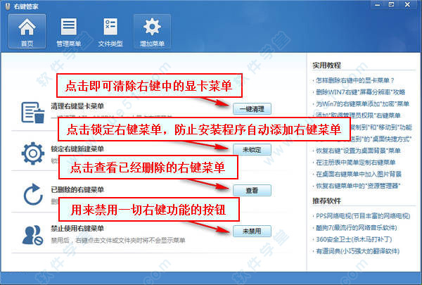 1、双击打开右键管家,软件界面上有几个常用的右键管理选项;