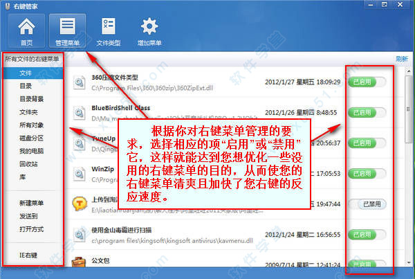 6、点击“管理菜单”,选择相应的项“启用”或“禁用”,这样就能达到您想优化一些没用的右键菜单的目的,从而使您的右键菜单清爽且加快了您右键的反应速度。
