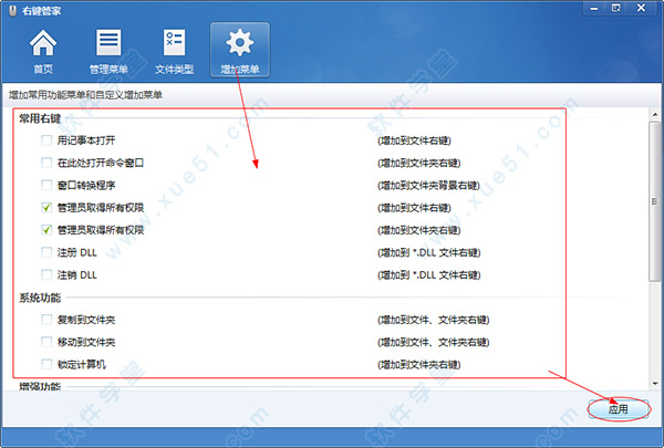 8、该软件还提供了对右键菜单的添加功能,您可以通过选择并勾选相应的项来实现您对右键功能要求的添加,从而将自己常用的选项添加到右键菜单中。