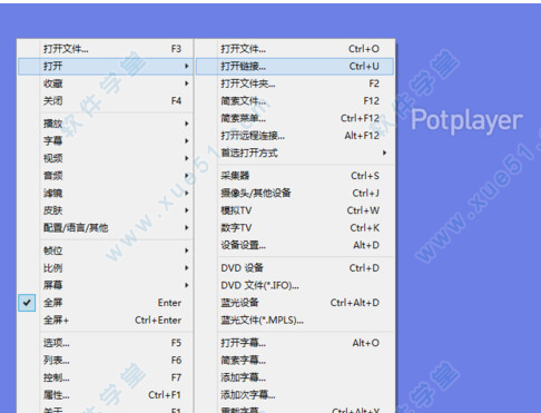1、右击播放器窗口,从弹出的右键菜单中依次选择“打开”项,此时将展开“打开”子菜单项,从中选择相应的子项即可实现视频的播放操作。如图所示,当我们选择“打开链接”项时,将弹出如图所示的窗口,在此直接粘贴要播放的视频文件地址,点击“确定”即可进行在线视频观看操作。