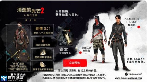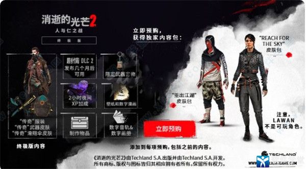 之前已经公开的“重出江湖”皮肤包依然是预购奖励内容,且不论何时预购了消逝的光芒2游戏,都能同时获得“重出江湖”皮肤包与 "翱翔天空" 皮肤包。