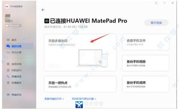 手机管理,轻松解决手机和计算机间的高速互联互通。“相册”、“音乐”完成与手机的自动连接并同步,实现手机照片、音乐的备份,解决手机内存不够的问题;“文件分享”与手机的“Huawei Share”完成文件的共享,实现多设备文件数据的直连免流量分享;一键热点直接将手机WLAN热点快速打开,实现电脑随时随地在网络条件下办公,在便捷上网的同时还能流量监控。~真的很方便!