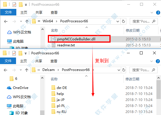 4、然后打开“PostProcessor66”文件夹,运行“SolidSQUADLoaderEnabler.reg”,然后这里有“Win32”和“Win64”两个文件夹,打开符合计算机系统的,将其中的文件复制到安装目录下,默认安装目录“C:\Program Files\Delcam\PostProcessor66\”目录下