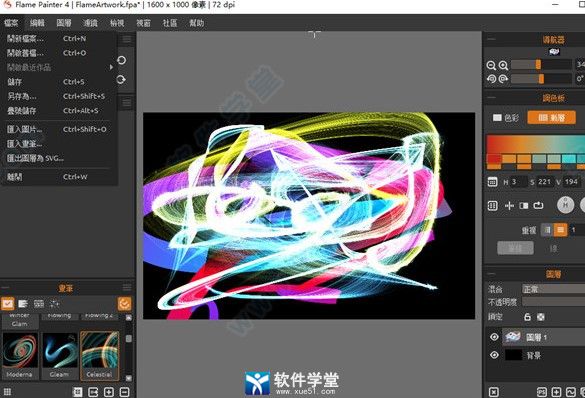 1、打开Flame Painter4,点击进入首页,点击档案文件,用户可进行新建、存储、另存为、导入图片等等操作;
