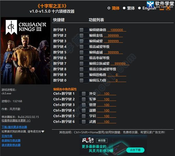 十字军之王3修改器风灵月影版,它是由风灵月影大大制作的
