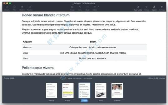 Yu Writer希望用户可以在一个舒适、专注的环境里创作内容,所以在界面上做到尽量的美观、简洁,你可以随时更换主题、隐藏不需要的部分,或者一键进入只有一个编辑框的专注模式。