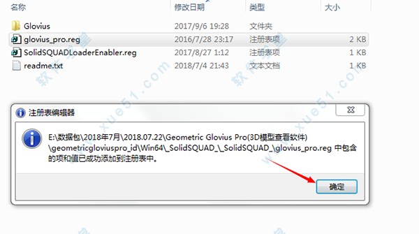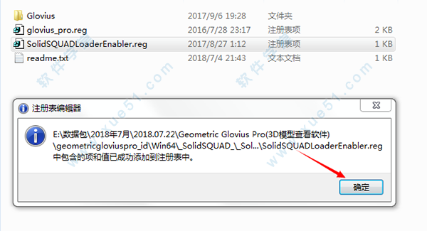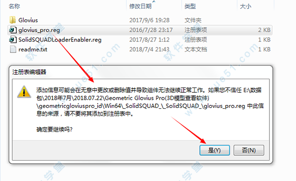 2、在“Glovius”目录中运行“glovius_pro.reg”,在弹出的注册信息中点击是。