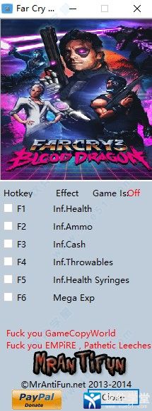 孤岛惊魂3血龙修改器MrAntiFun版,它是专为该游戏制作的一个游戏修改辅助工具,使用后可帮助玩家轻松获取无限生命、无限金钱、海量经验等等多种功能,感兴趣的朋友欢迎前来下载。