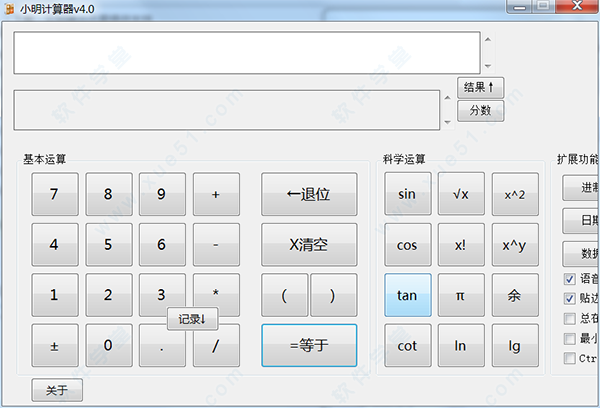 小明计算器是一款功能齐全的计算机。计算机是我们小时候经常会用到计算工具,小时候由于计算能力比较弱,很多时候我们都会通过计算器将一些数额比较大的数值计算出来,非常的实用。而小编为大家带来的此款软件,它的功能可就比我们小时候用的要强大多了,能完成更加复杂的运算。用这款软件可以计算基本运算、扩展运算、科学运算、日期计算等。取市面上计算器各大优点的一款强大的科学型计算器,可以说其他计算器有的,我们都有,它们没有的,我么还有。支持笔记本数字按键联动,输入框字体自动缩放。算法也很先进,智能识别数字与运算符号,符合国人的思维逻辑。而且这款小明计算器软件最大的优点就是小巧几乎不占内存并且绿色直接使用哦!有需要的小伙伴可以下载看看。