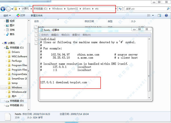 2、文件替换完毕后,打开C:\Windows\System32\drivers\etc目录,找到“hosts”文件,以记事本方式打开“hosts”文件,打开之后将127.0.0.1 download.tecplot.com 复制粘贴进来,然后保存退出