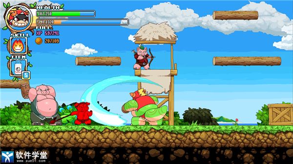 生命值减少后,主角可以坐下燃烧脂肪来回复生命值。打败敌人之后可以积累经验值,升级天赋(物理攻击、生命回复和魔法攻击)。笔者认为,如果跳跃动作有所改进,那么本作在各方面都能称得上是一部佳作了。如果在天赋升级方面能新增一些攻击动作,那就更好不过了。