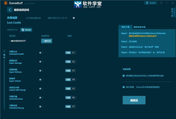 失落城堡修改器是一款能够让玩家爽到爆的游戏辅助工具,这款修改器的功能十分简单,开启后玩家便可以获得无限生命、超级伤害、超级防御、超临界、技能无冷却、无限灵魂、无限金钱共其中不同的辅助选项,不仅能够快速提升角色的各项属性数值,还能为玩家提供多种不同的玩法思路,同时玩家不再需要担心因为难度过高而无法通关。此外,这款修改器几乎没有任何限制,玩家只需要在使用前关闭所有的
