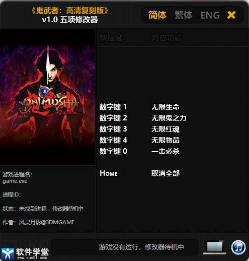鬼武者重制版是一款非常经典的游戏,对于很多玩家来说都是情怀满满,最早的一批玩家都可以追溯到2001年,也就是鬼武者的玩家,鬼武者重制版就是鬼武者的高清HD重制版!这一次,小编要推荐给大家的这款修改器就是专门为这款游戏打造的,修改器的名字就叫做