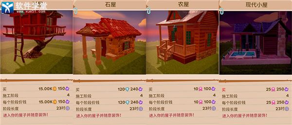 除了种菜养猪钓鱼植树我们还可以打扮自己的专属小窝【 老巢 】,截至2018年7月17日共有4款不同风格的房屋可供选择。
