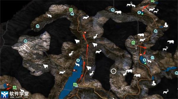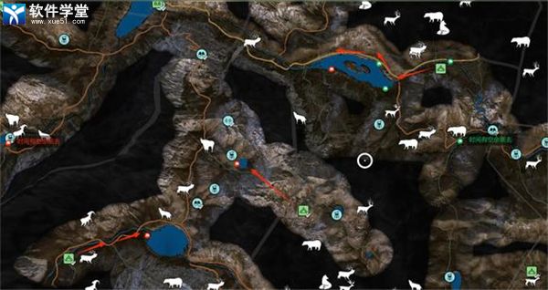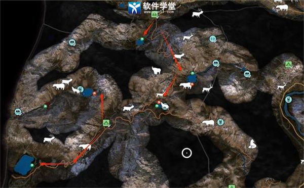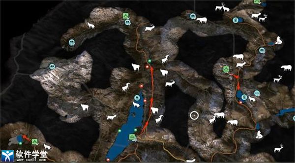 以下是我常打的点位,红色旗帜代表大角羊热门点位,绿色旗帜代表野山羊热门点位,红色箭头代表游猎路线。如果去了发现没有任何猎物,可以试着小退重进一下,或是调时间再来。若路线很长,建议开车。