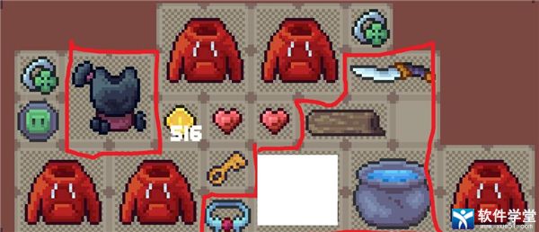 如图所示,必要的物品为红框内的:忍者服装,大锅,朽木,辟邪手镯,还有一个你用来叠黄金砥石的武器(通常为刺客匕首),并且需要留5格空白。