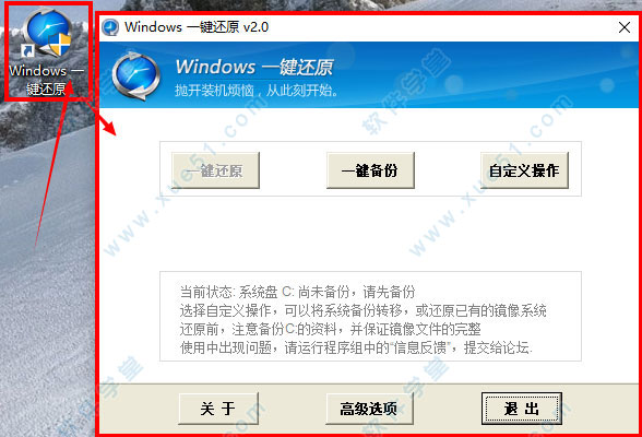 4、安装完成后桌面显示的图标,运行后的程序界面,现在我们来设置一下一键还原功能,先进去高级选项设置一下还原密码和热键。