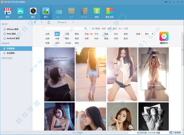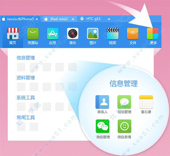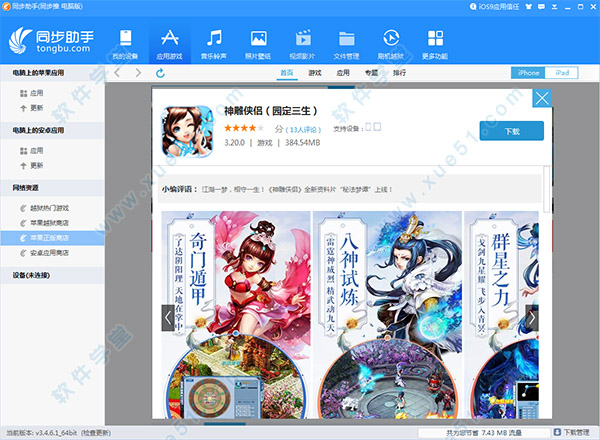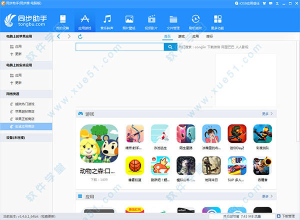 手机助手工具。软件具有海量游戏、应用、壁纸、铃声便捷下载,更能修复闪退、备份还原个人数据、清理垃圾、制作手机铃声、越狱、备份微信聊天记录、下载微信个性表情等。软件资源丰富、功能齐全、安全轻便、同时支持多平台。其所属的同步网络是大陆著名的移动应用分发、游戏联运及移动设备管理平台,总用户数超过1亿,月活跃用户超过千万,联合运营的游戏数量超过1500款,多款游戏日充值突破百万。软件与安装在移动端的同步推相比,除了下载应用外还具有强大的设备管理功能,是你玩转智能手机的最佳选择。本次小编给大家带来的是