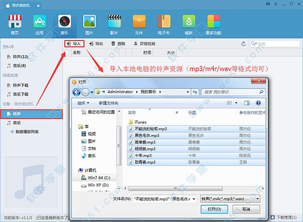 1、同步助手怎么导入铃声?连接设备到软件,切换到音乐界面。选中设备底下到铃声区,点击【导入】可添加电脑本地的铃声资源(支持mp3、m4r、wav等格式),如下图。
