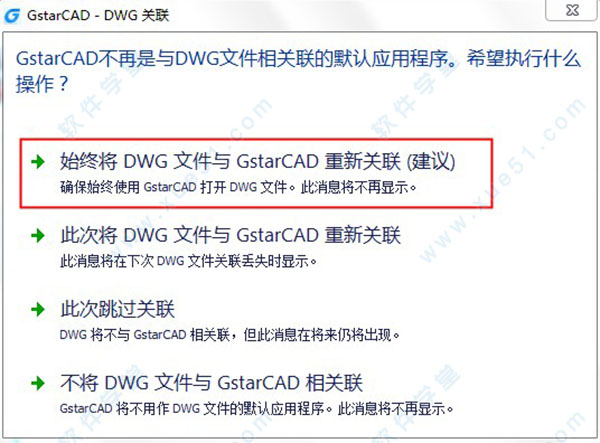 2、点击“试用”软件,弹出关联dwg文件界面,选择“始终将dwg文件与gstarcad重新关联”,如下图所示: