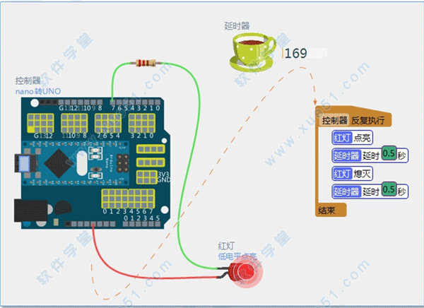 3、鼠标左键点击指示灯模块可以添加到编程界面(以此类推)。