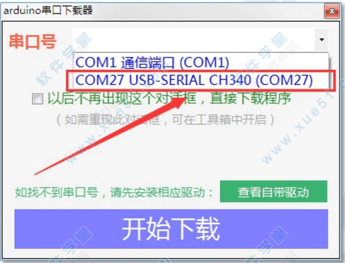 9、当我们编辑好程序之后,就可以开始硬件搭建了。按照软件里的连线,连线好硬件模块,然后点击软件左上角的logo出现一个串口选择框,点击选择带有CH340字样的串口,点击“开始下载”等待进度条走完即完成。