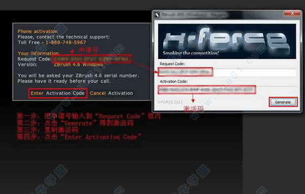 3、回到软件安装包打开注册机,复制“Request Code”申请号后,将申请号输入到“Request Code”框内,点击“Generate”按钮得到激活码,把计算出来的激活码完全复制,点击“Enter Activation Code”按钮