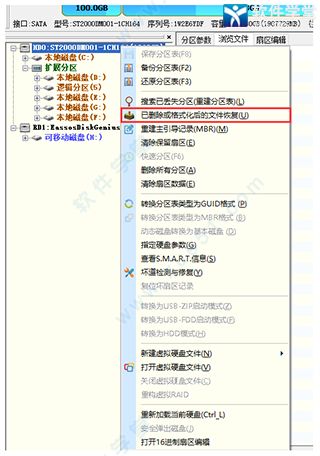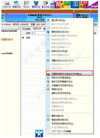 4、不同于一些给小白用户使用的傻瓜式的数据恢复软件,如果您是第一次使用此软件,可能不能马上找到执行恢复数据操作的入口,但其实很简单。如果您能确定您要恢复的数据存在于哪个分区上,那么直接在界面上方的硬盘分区图中,选中分区,点击鼠标右键,然后在弹出的快捷菜单中,选择菜单项“已删除或格式化后的文件恢复”。