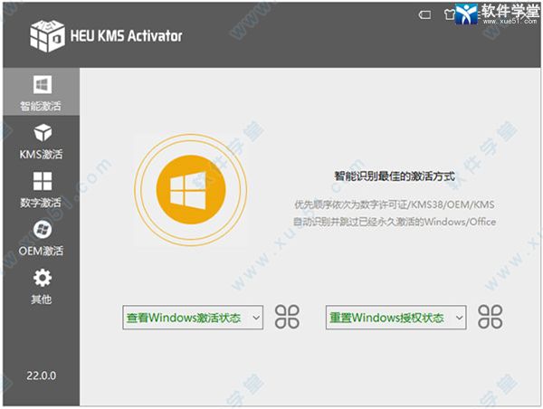 7、也可进行智能激活:点击“橘黄色按钮”,将激活 Windows 和 Office,智能识别最佳的激活方式(优先顺序依次为数字许可证/KMS38/OEM/KMS),并自动跳过已经永久激活的版本。