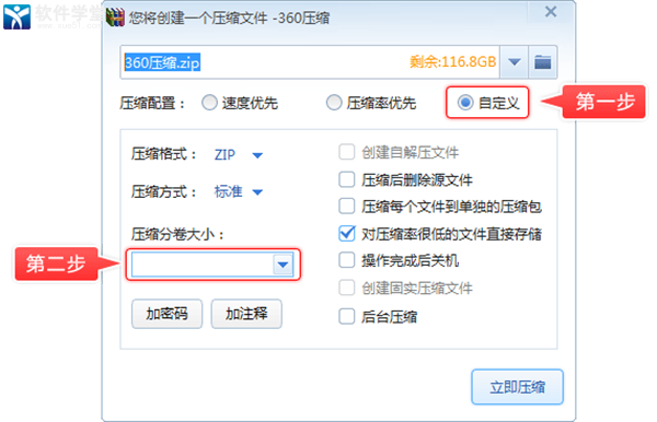 2、添加文件进行压缩提供了速度最快、体积最小以及自定义模式。供用户们进行选择