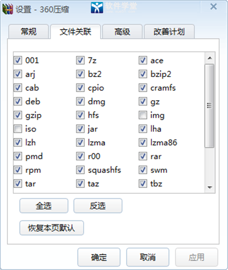 4、如何更改默认的压缩格式关联?在360压缩的右上菜单,点击【工具】,选择【选项】,并在新弹出的【设置】界面中,点击【文件关联】标签,通过勾选不同的压缩格式来更改软件默认的压缩格式关联,点击【确定】来确认更改的压缩格式关联