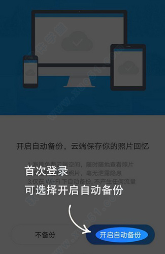 1、首次登录软件的账号,可以在开始询问页面选择开启自动备份,然后相册会在有Wi-Fi环境下进行自动备份。