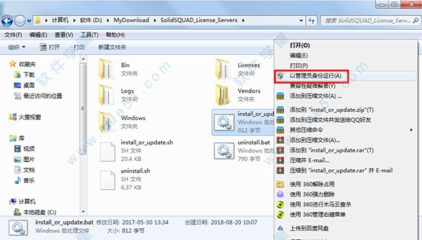 3、以管理员的身份运行SolidSQUAD_License_Servers下的"install_or_update.bat"。