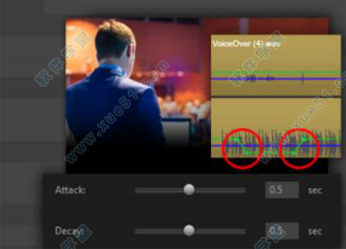 微调音频调节的引入时间和引出时间,自动调低背景音让叙述者的声音更清楚。