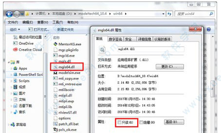 1、软件安装完成之后,打开软件安装目录,找到“mgls64.dll”文件,右键文件属性取消只读属性。默认安装路径:C:modeltech64_10.4win64