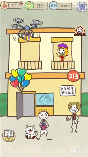 关卡2送礼物,将气球和礼物捆绑在一起,让礼物飞到女神手上,如图所示