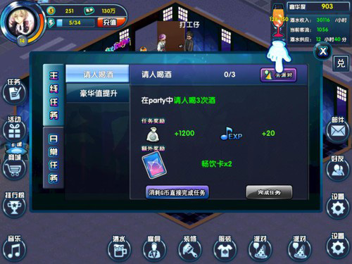 酒水是玩家经营夜店的主要玩法,也是玩家用来盈利获取游戏币的主要途径:玩家通过购买酒水和出售酒水来获取利益,同时升级和扩容酒水能提升收益。
