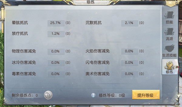 修炼中可以通过修炼点加点提升伤害减免、负面抵抗等效果。修炼点可以通过右下角的提升等级提升修炼等级获得!