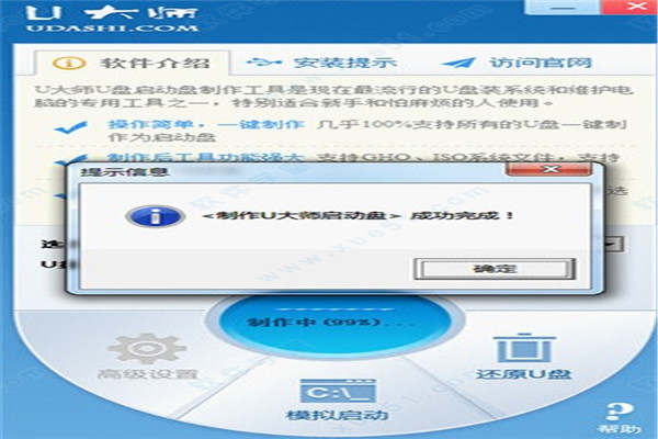 4、制作完成之后会弹出提示框,点击“确定”即可,将U盘安全删除并拔出重新插上便可用USB当作启动盘来使用。