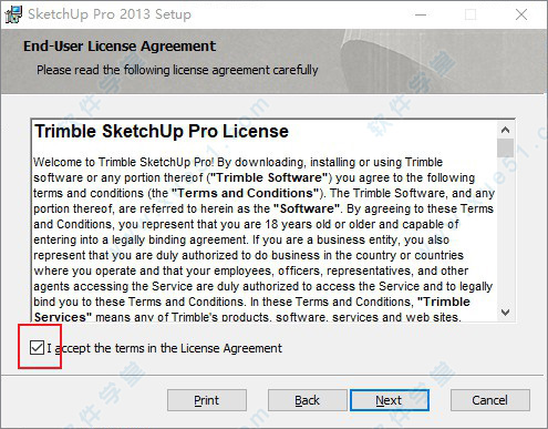 1、双击运行SketchUpProWEN.exe程序开始安装软件,进入安装界面,在方框勾选,同意软件相关许可协议